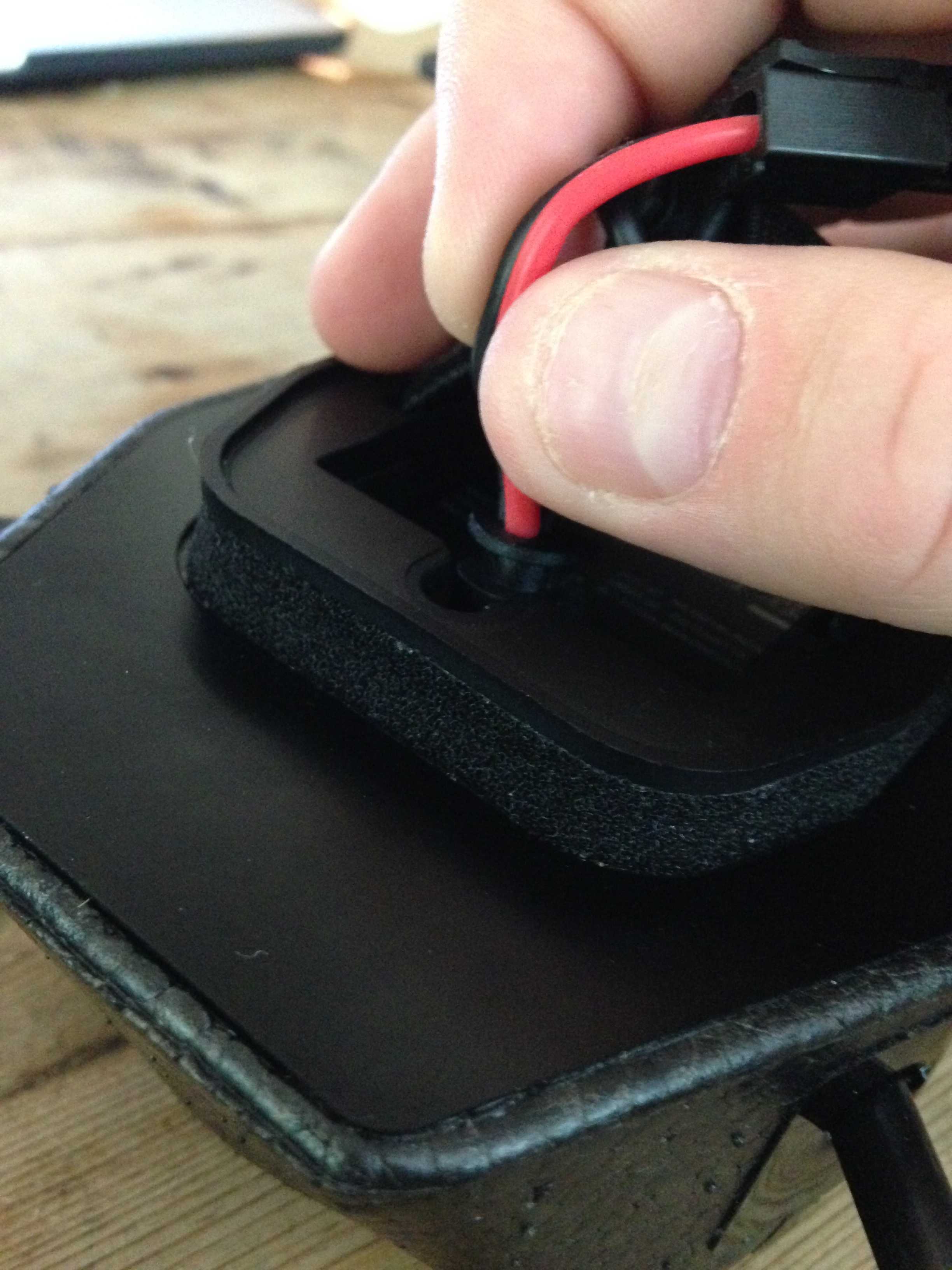 Slide the power cable and USB port up through the slit you cut earlier and attach it into place.