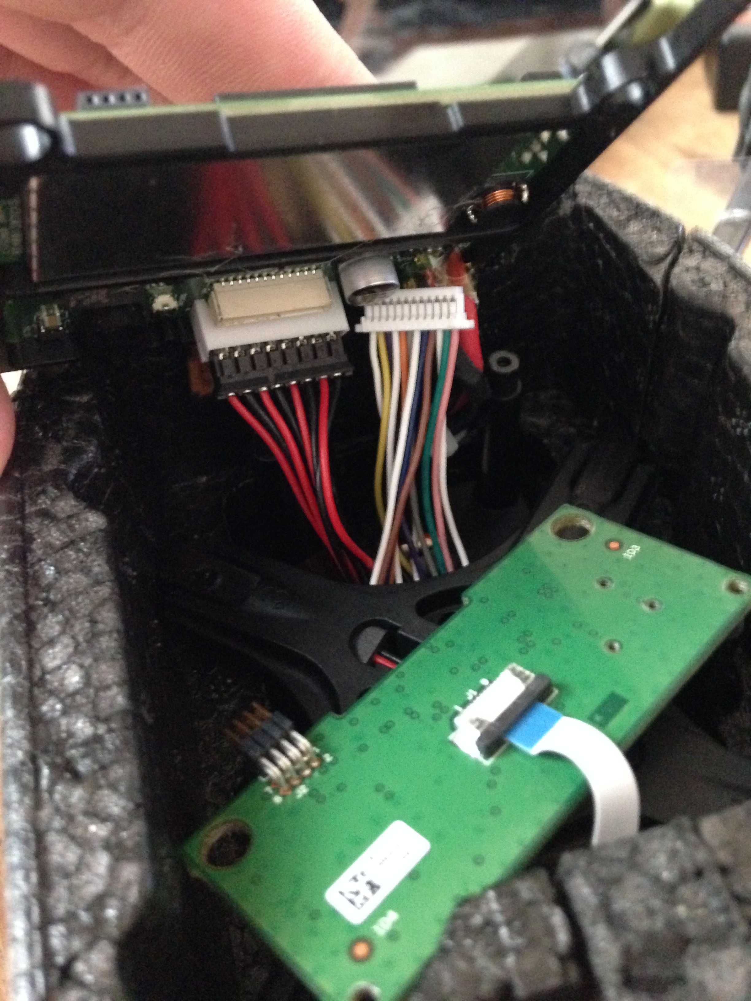 Plug in the blank and blank into the bottom of the motherboard and the blank into the top. Then push the motherboard and navboard into place, making sure not to tangle up any wires. Screw both boards into place. Do not put the bottom cover on yet! You need to change the motors, propellers, and gears first. This way if something isn’t working right you don’t have to pry off the panel.