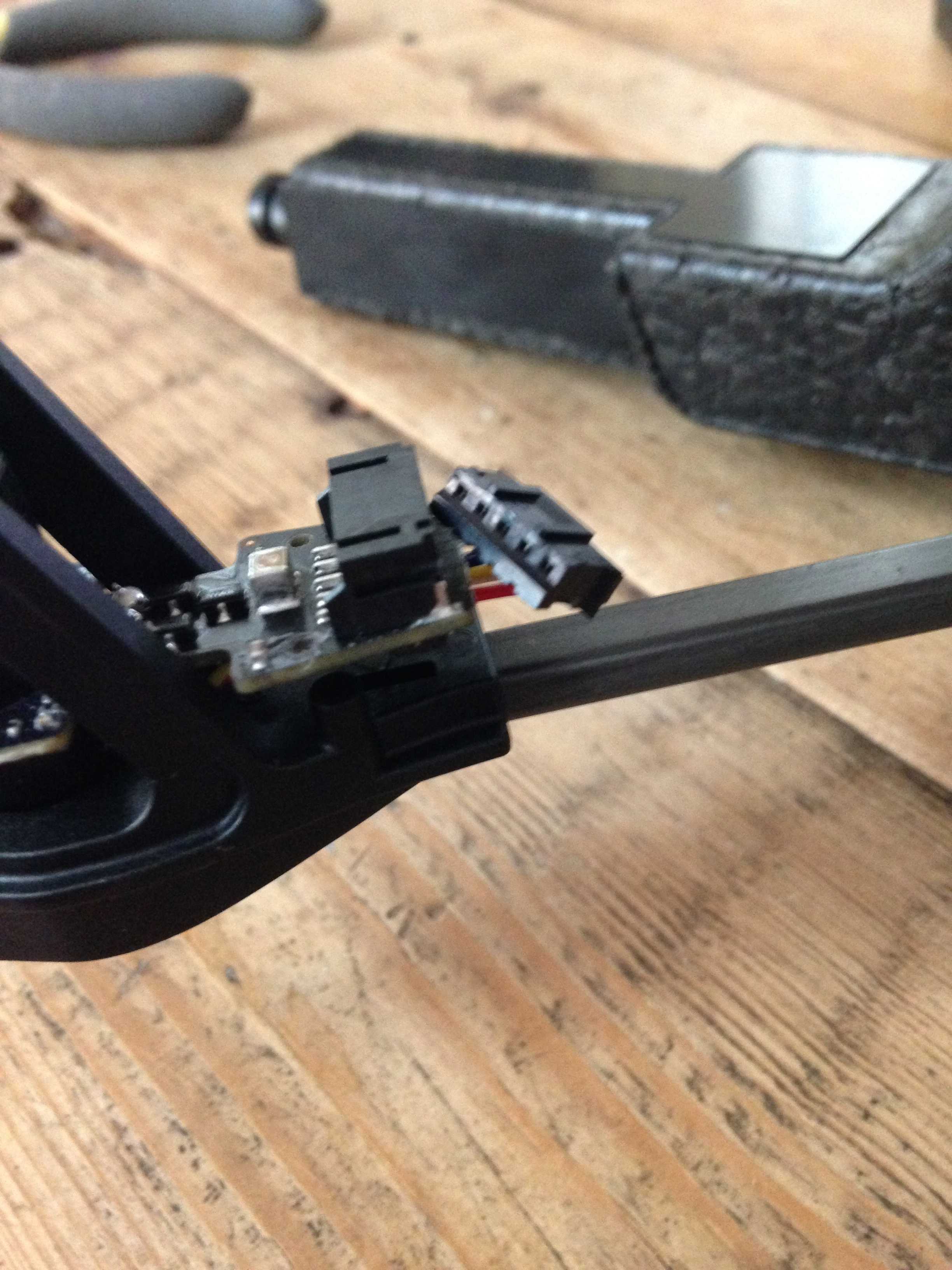 Next, detach the two brown ribbons connected to the motherboard. The one to the left (in the left picture) comes off no problem. You just have to pull it off gently. The ribbon to the right (in the left picture) requires a little more work. You have to loosen the black piece that the ribbon slides into by pulling it away from the body about 1mm or so. Once the black piece is loosened (not detached), you can simply slide the ribbon out. After you’re done with the motherboard flip the copter over and unclip the power cable on top.